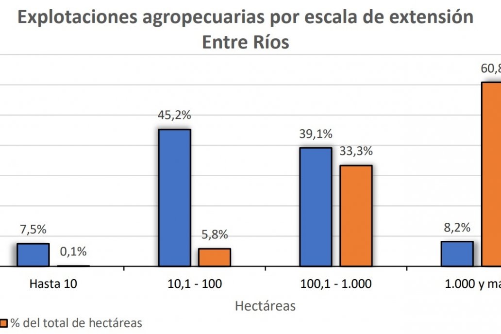 Un 8,2% de las explotaciones agropecuarias en Entre Ríos tiene a su cargo la gestión del 60,8% de las hectáreas que producen bienes agrícolas, pecuarios o forestales destinados al mercado.