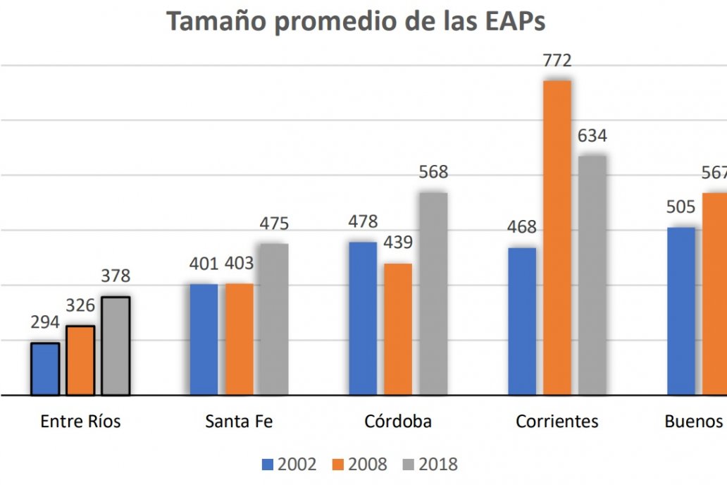Como contracara a esta situación, el tamaño promedio de las explotaciones agropecuarias en Entre Ríos ha crecido un 28,5% desde el censo de 2002 hasta 2018, pasando de 294 a 378 hectáreas por EAP respectivamente, siendo la provincia de menor tamaño promedio de EAP en el grupo comparado. Este crecimiento del tamaño promedio es una tendencia generalizada en todas las provincias del país, donde el mayor incremento observado corresponde a la provincia de Corrientes con un 35,6% y el menor en Santa Fe con un 18,3%.