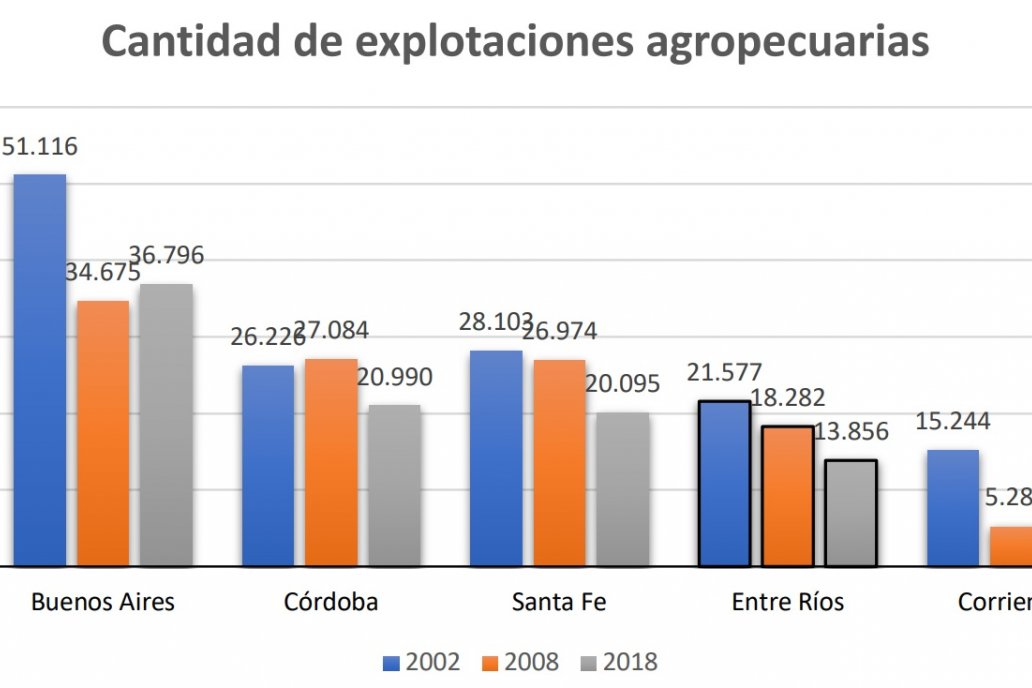 En primer lugar, se destaca la continua caída de cantidad de explotaciones agropecuarias (EAPs) que se ha dado tanto a nivel provincial como nacional, que se refleja con datos del censo agropecuario de 2002 al comparar con los más actuales de 2018 obteniendo disminuciones en el número de explotaciones del 35,8% en Entre Ríos, 28% en Buenos Aires, 20% en Córdoba, 28,5% en Santa Fe y 28,2% en Corrientes.