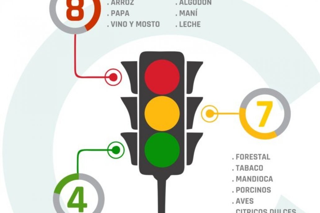 El semáforo analiza tres componentes: negocio, productivo y mercado. El primero evalúa la evolución del precio y el costo, tanto mensual como interanual. El segundo mide el área o stock, según corresponda, y la producción. Y el último, la evolución de las exportaciones y las importaciones de las producciones, así como el consumo interno.