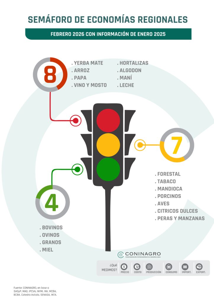 Para recordar, el semáforo de economías regionales se publica de manera mensual desde hace más de ocho años, lo que permite observar el desempeño de las distintas actividades en una perspectiva de largo plazo. En ese período, 8 de las 19 economías analizadas permanecieron en rojo durante más de la mitad del tiempo. Entre las situaciones más comprometidas se destacan la vitivinicultura y los cítricos dulces, que registraron indicadores en rojo en más del 70% de los meses. Les siguen la actividad citrícola, con el 67% de los meses en rojo, y la lechería, con el 65%.