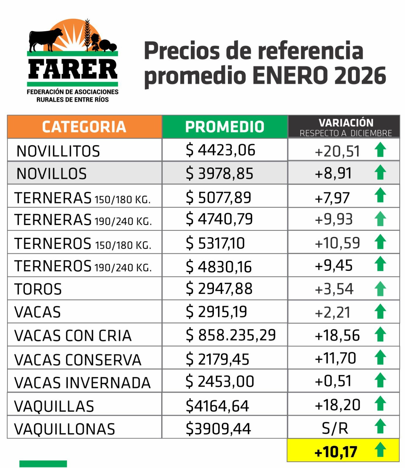 Los remates de hacienda en pie realizados en las rurales entrerrianas durante enero registraron un incremento mensual promedio del 10,17 %, reflejando una plaza firme, sostenida y con una demanda activa en la mayoría de las categorías.