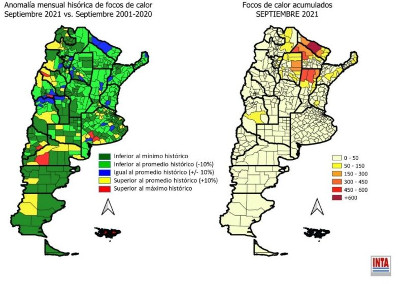 Por el contrario, departamentos como Florentino Ameghino o Coronel Suarez en Buenos Aires, o bien 25 de Mayo en San Juan, o Picun Leufu en Neuquén acumularon pocos focos de calor (menos de 20), pero la cantidad registrada fue superior al máximo histórico registrado en cada uno de ellos para septiembre considerando la serie histórica 2001-2020.