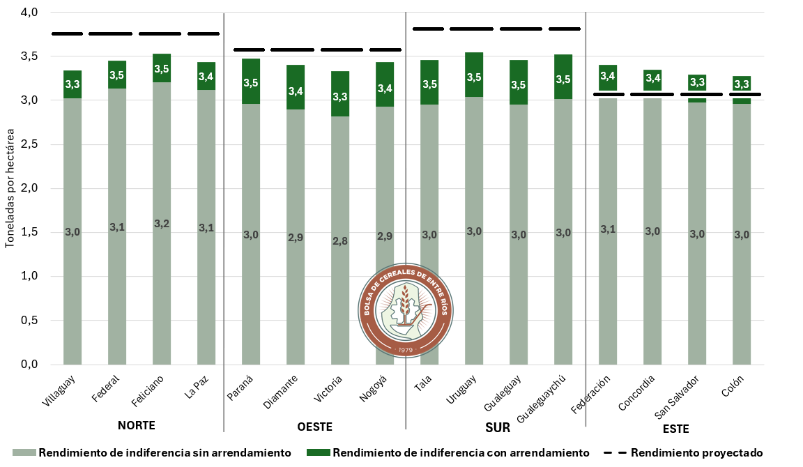 El estudio concluye en que la campaña de trigo en Entre Ríos se perfila productivamente muy buena, pero económicamente frágil con un promedio provincial de margen bruto de 25 dólares por hectárea. Sin embargo, la rentabilidad dependerá casi por completo de que se sostengan los rindes estimados y que el precio no profundice su caída, para evitar que una campaña técnicamente buena termine en un resultado económico negativo.