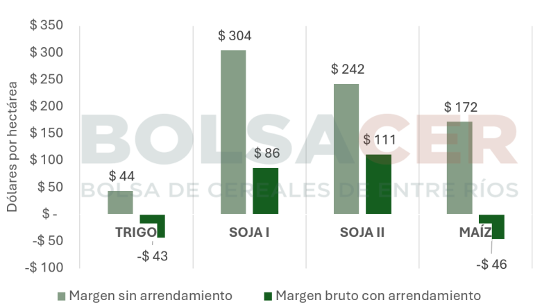 Al considerar el pago de arrendamiento anual, la rentabilidad sólo es positiva en el promedio provincial en el caso de la soja, tanto de primera (con un 12%) como de segunda (aproximadamente 20%). En el caso del maíz y del trigo, se incurriría en pérdidas en promedio del 4% y del 7% respectivamente, con márgenes negativos en torno a 45 dólares por hectárea.