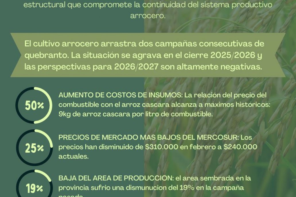 Bajo este escenario, la producción provincial de arroz se proyecta en 449.770 toneladas, lo que implicaría una caída del 18% en comparación con la campaña pasada.