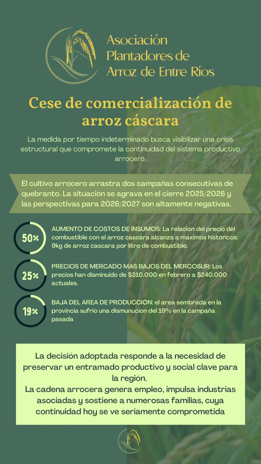 Arroceros de la Asociación de Plantadores definieron cesar la comercialización de grano en cáscara. La iniciativa espor tiempo indeterminado y el objetivo es visibilizar la situación del sector. Sostienen que vienen de dos campañas lamentables, de quebranto, y que el escenario a futuro no ofrece señales de aliento. Dan cuenta de un 50% de suba en el costo de sus insumos; una baja notable de los precios internacionales que miden en el 25%; y empalman con el descenso del área implantada.