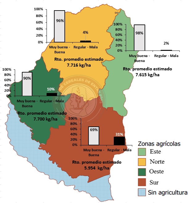 En términos de rendimiento esperado por zonas, las regiones Norte, Este y Oeste presentan promedios cercanos a 7.600 kg/ha. En la zona Sur, el rendimiento se estima en 6.000 kg/ha, con una marcada diferencia respecto del resto del territorio, como consecuencia de las escasas precipitaciones, fundamentalmente durante el mes de diciembre que afectaron el número y peso de los granos.