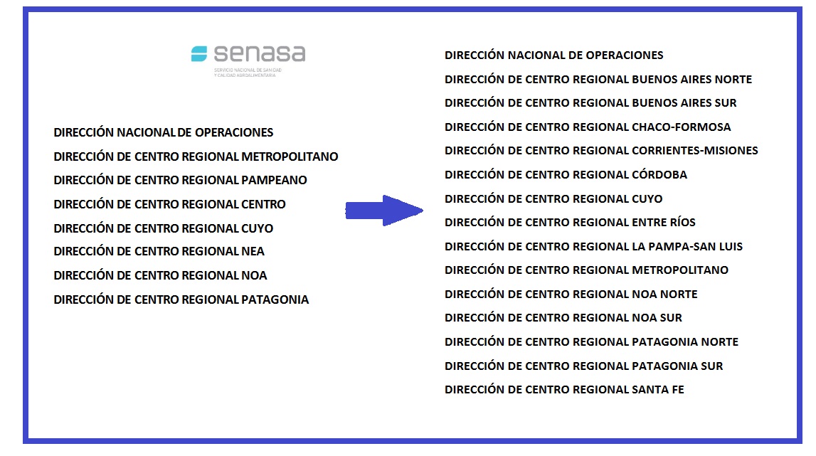 La estructura del Senasa, que contaba con siete direcciones regionales (Metropolitana, Pampeana, Centro, Cuyo, NEA, NOA y Patagonia), fue ampliada a catorce: Buenos Aires Norte, Buenos Aires Sur, Chaco Formosa, Corrientes Misiones, Córdoba, Cuyo, Entre Ríos, La Pampa San Luis, Metropolitano, NOA Norte, NOA Sur, Patagonia Norte, Patagonia Sur y Santa Fe.