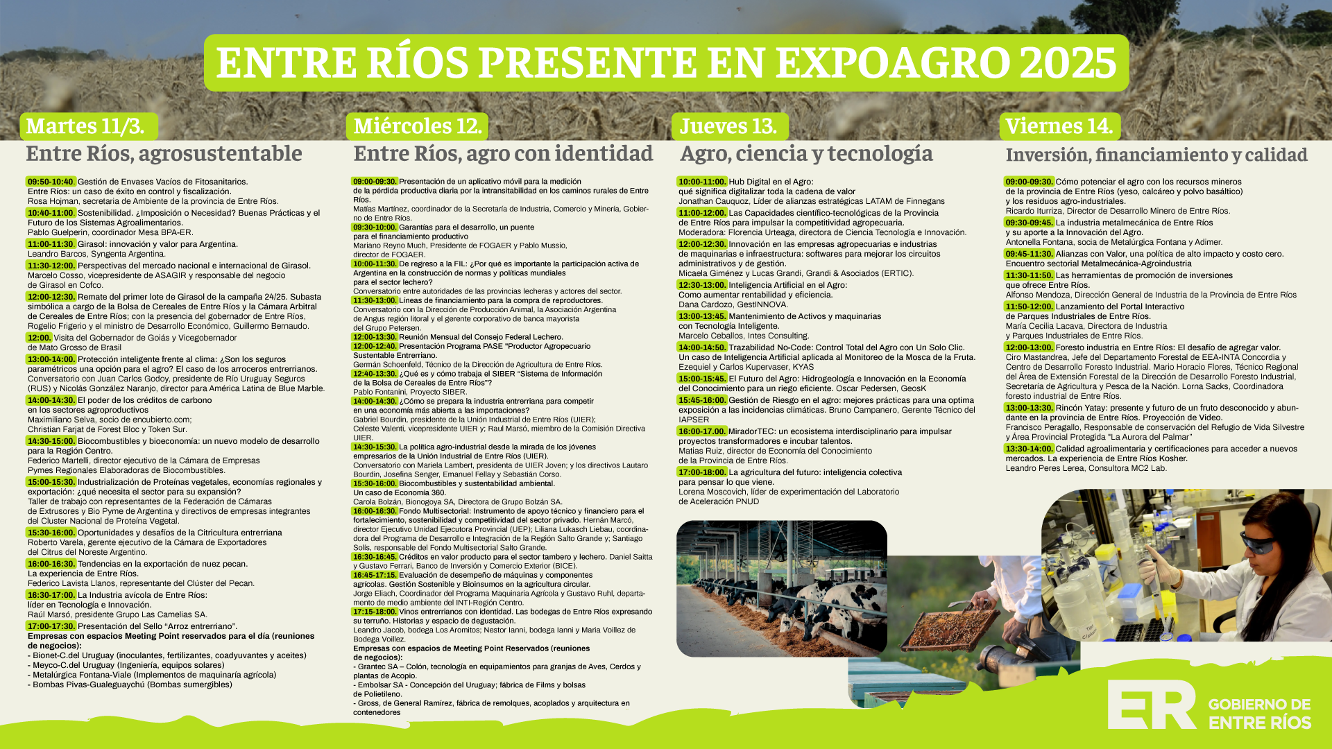 14:30-15:30. La política agro-industrial desde la mirada de los jóvenes empresarios de la Unión Industrial de Entre Ríos (UIER). Conversatorio con Mariela Lambert, presidenta de UIER Joven; y los directivos Lautaro Bourdin, Josefina Senger, Emanuel Fellay y Sebastia?n Corso.