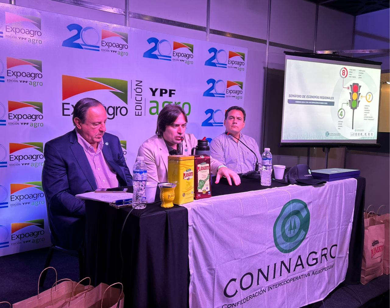 La muestra que se desarrolla desde el martes en San Nicolás, también mostró la otra cara del campo. De la mano de su presidente, Lucas Magnano, la Confederación Intercooperativa Agropecuaria (Coninagro) presentó en Expoagro una nueva edición de su informe mensual denominado “semáforo de las economías regionales”. La luz roja es mayoritaria en muchas regiones del país.