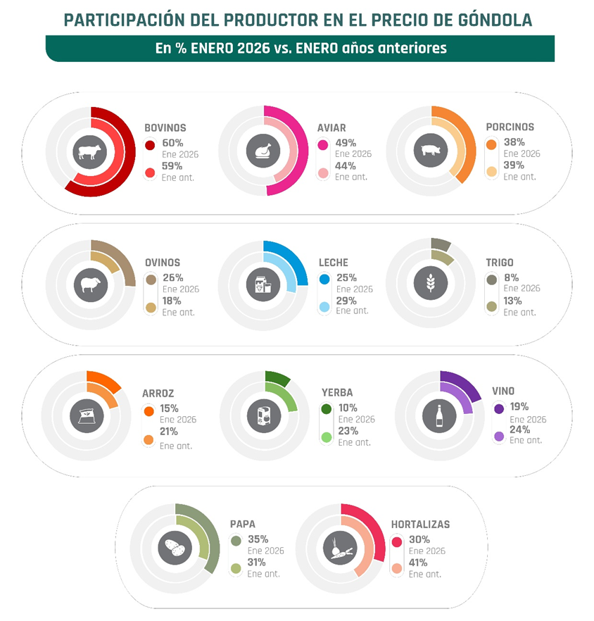 El indicador permite comparar la porción del precio de “góndola” que recibe el productor en el mes analizado con el promedio registrado para ese mismo mes en años anteriores. De esta manera, se busca identificar si la participación del productor se encuentra por encima o por debajo de su comportamiento histórico. En los productos pecuarios, la participación del productor en ovinos alcanzó en enero de 2026 el 26%, mientras que el promedio de los últimos cinco años para ese mismo mes se ubicó cerca del 18%. Esto implica una mejora de 8 puntos porcentuales respecto de los eneros anteriores. En el caso del pollo, la participación en enero de 2026 fue del 49% del precio final de góndola, frente a un promedio histórico cercano al 44% para ese mes, lo que representa una suba de 5 puntos. Por su parte, en las cadenas de bovinos y porcinos la participación se mantuvo bastante estable en los últimos años: en enero de 2026 se ubicó en 60% y 38%, respectivamente, valores muy similares a los promedios históricos para ese mes.