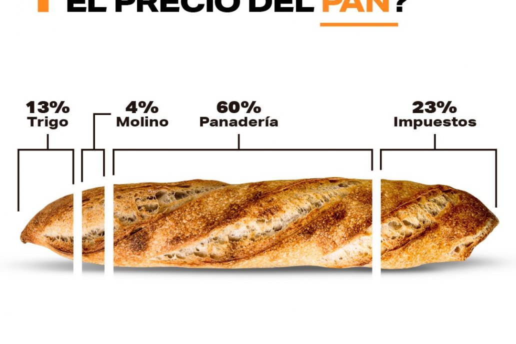 Del total que paga el consumidor por kilo de pan francés. El trigo representa el 13%, el molino el 4%, la panadería el 60% y los impuestos el 23%. Del campo a nuestra mesa el precio del trigo se multiplica por 7,5. “Para decirlo de otra forma, el consumidor pagó en promedio $202,5 el kilo de pan, de los cuales $47 corresponden a la carga tributaria”, afirma la economista.
