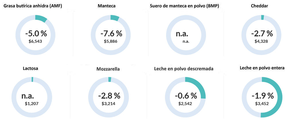 En el siguiente gráfico, los valores obtenidos en todos los productos de la subasta N° 392 del Global Dairy Trade: