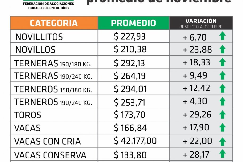 Noviembre experimentó las principales subas en toros (+ 29,26 %); vacas conserva (+ 28,17 %); novillos (+ 23,88 %); vacas con cría (+ 22,00 %) y terneras de entre 150 y 180 kilos (+ 18,33 %). Además, la pizarra marcó por segundo mes consecutivo aumentos en todas las categorías.