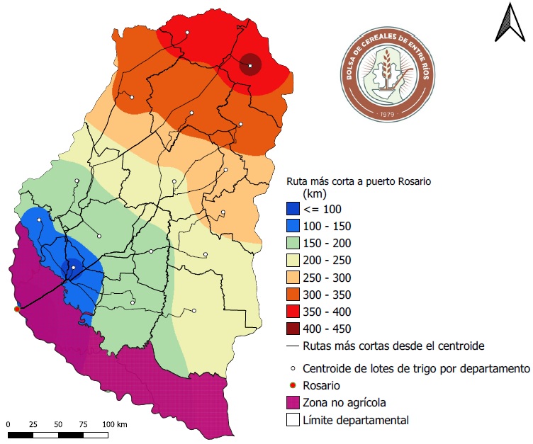 La estimación se realizó con la generación para cada departamento de un centroide de los lotes de trigo detectados. El centroide es el punto que sintetiza espacialmente la posición promedio de todos los lotes y sirve como referencia geográfica del “centro de gravedad” para cada departamento. Se computó con la utilización de la red vial, el recorrido junto con el cálculo de la distancia más corta hasta la ciudad de Rosario.