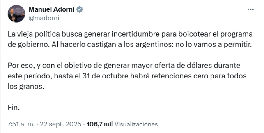 La medida fue comunicada por el vocero presidencial, Manuel Adorni; se busca que el campo acelere el ingreso de divisas para robustecer las reservas del Banco Central, que la última semana vendió US$1100 millones por la tensión cambiaria. Regirá hasta el 31 de octubre.