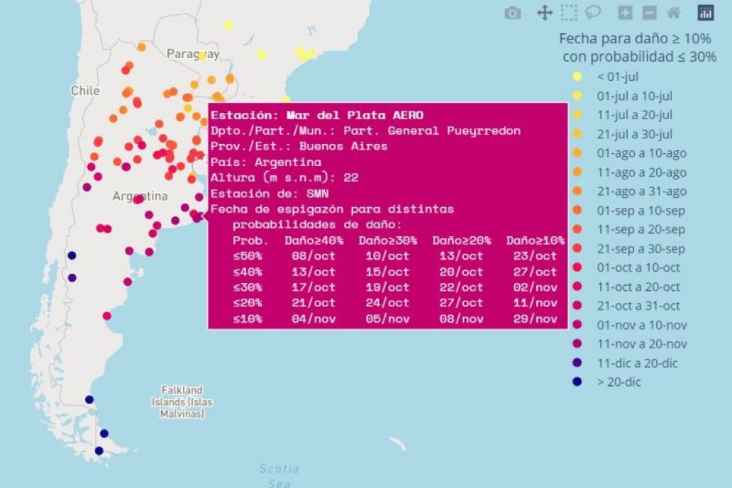“El hecho de que el mapa sea interactivo permite interpretar mejor la información volcada porque en la escala mayor del mapa hay algunas estaciones superpuestas que no pueden verse con claridad a menos que se pueda hacer zoom”, explicó Abbate y agregó: “Basta con pararse con el cursor en cada uno de los puntos para ver reflejado el porcentaje de daño por helada en cada una de las fechas propuestas”.