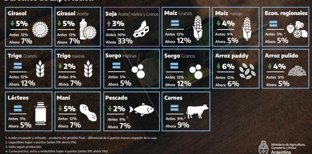 Los cítricos y otras frutas (peras, manzanas, etcétera) como otras economías regionales como las legumbres quedaron con un derecho de exportación del 5%-