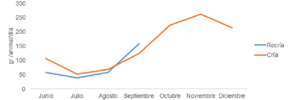 El seguimiento del consumo se realizó durante la recría de vaquillas sobre pastura degradada y sobre un rodeo de cría en campo natural. En la Figura 1 se presenta el consumo de bloques de ambas categorías. Las vaquillas de reposición en etapa de recría incrementaron el consumo a la salida del invierno. En las vacas de cría se observó el mismo patrón. El consumo durante la época de parición y lactancia (octubre, noviembre, diciembre) fue el doble respecto de la época de gestación.