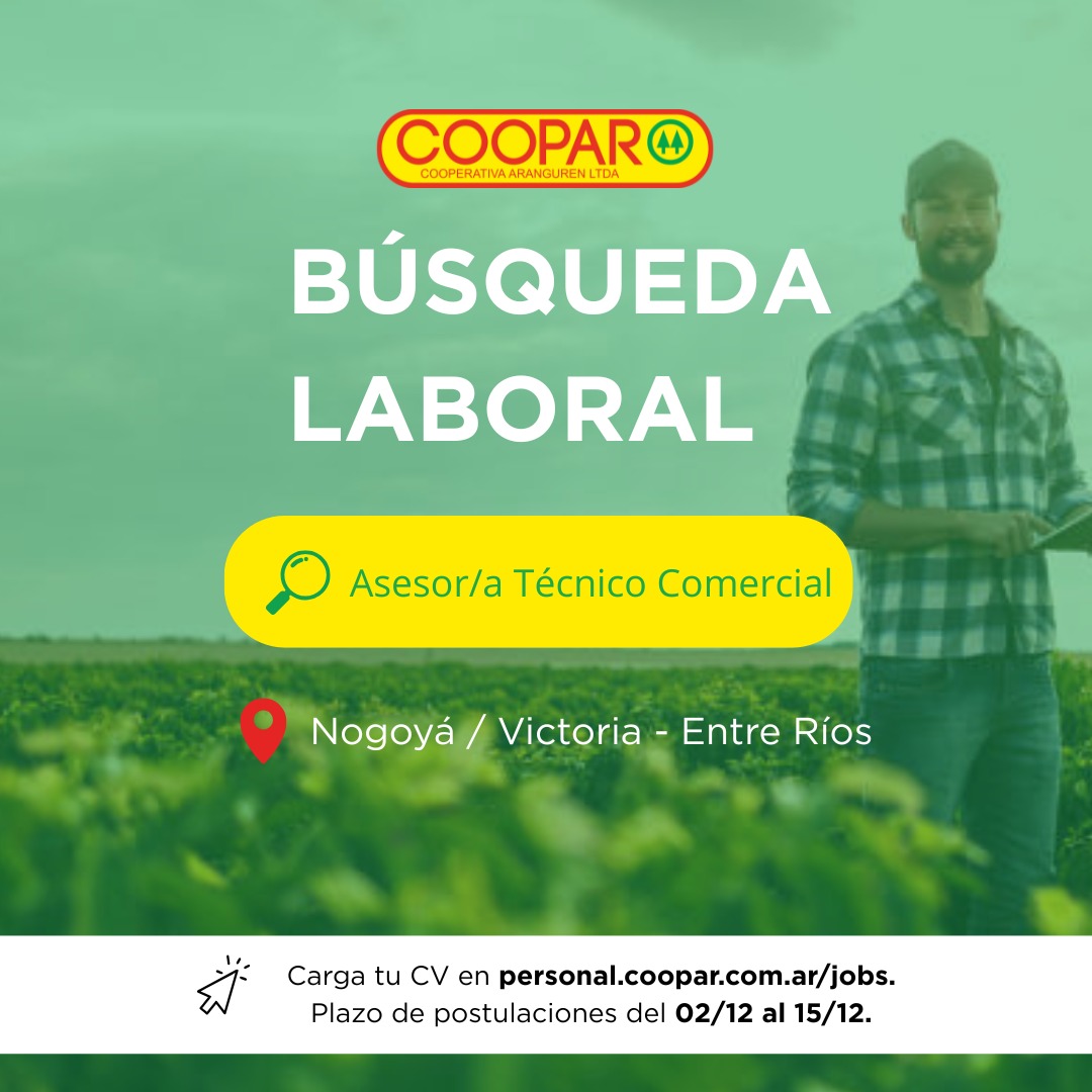 Asimismo, Coopar abre convocatoria para incorporar un/a Asesor/a Técnico Comercial, orientado/a al trabajo con productores agropecuarios.